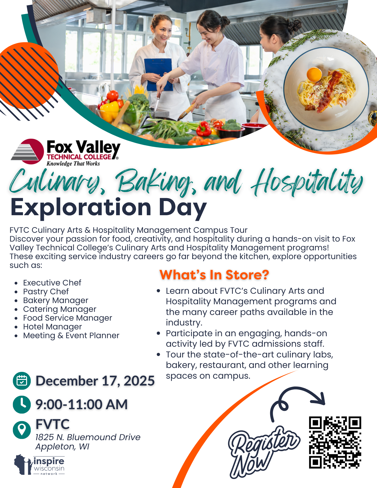 Discover your passion for food, creativity, and hospitality during a hands-on visit to Fox Valley Technical College’s Culinary Arts and Hospitality Management programs!
