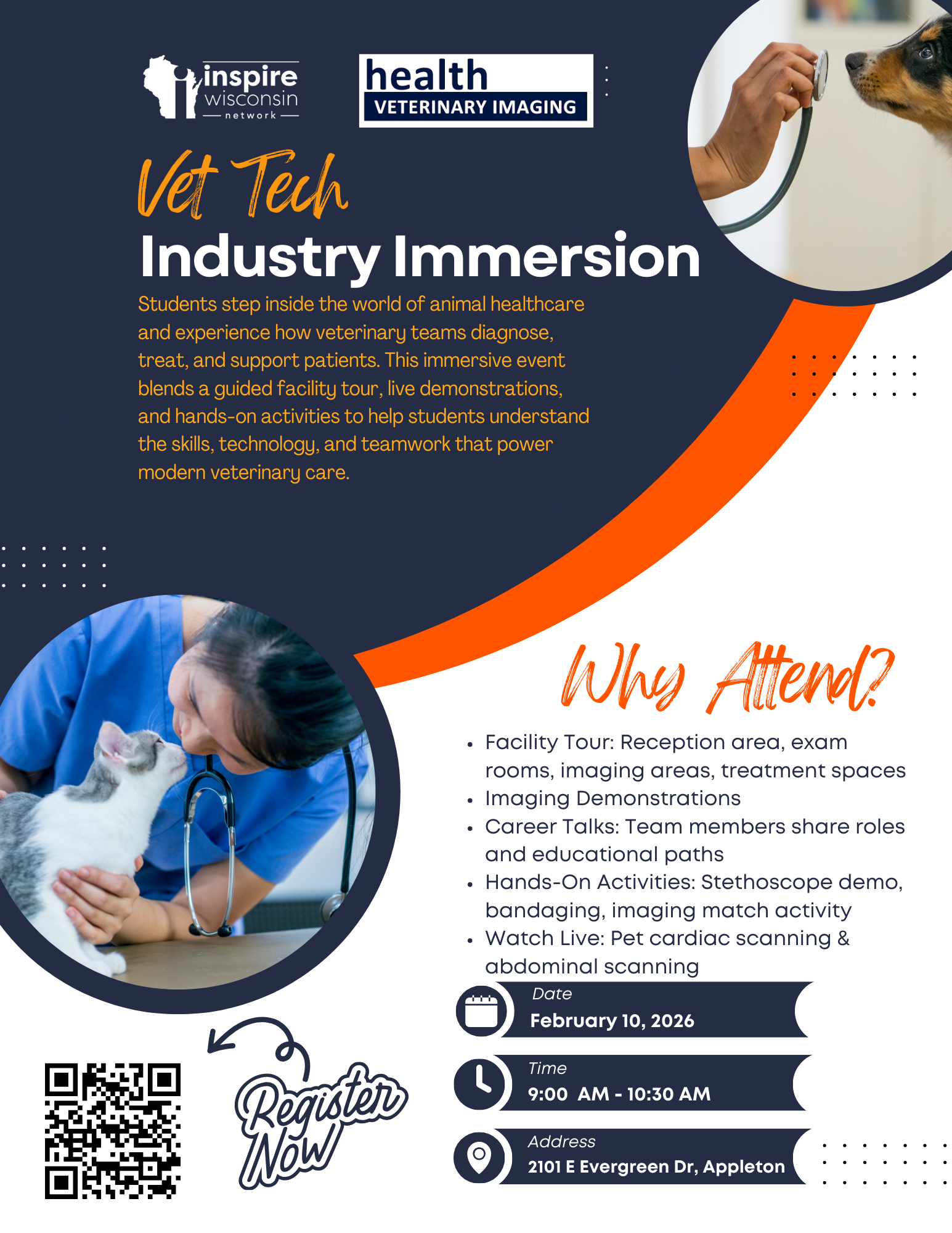 Students step inside the world of animal healthcare and experience how veterinary teams diagnose, treat, and support patients. This immersive event blends a guided facility tour, live demonstrations, and hands-on activities to help students understand the skills, technology, and teamwork that power modern veterinary care.