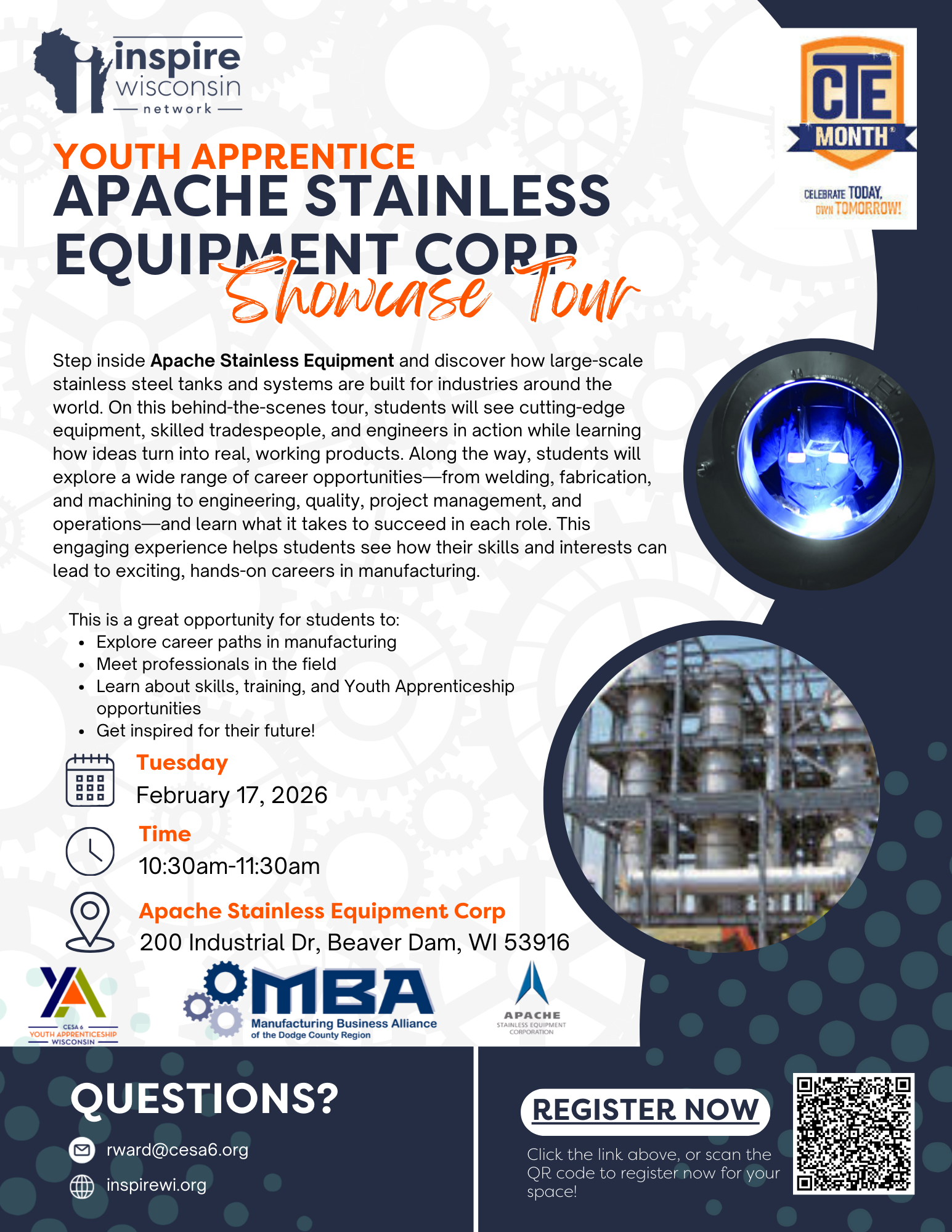 Step inside Apache Stainless Equipment and discover how large-scale stainless steel tanks and systems are built for industries around the world. On this behind-the-scenes tour, students will see cutting-edge equipment, skilled tradespeople, and engineers in action while learning how ideas turn into real, working products. Along the way, students will explore a wide range of career opportunities—from welding, fabrication, and machining to engineering, quality, project management, and operations—and learn what it takes to succeed in each role. This engaging experience helps students see how their skills and interests can lead to exciting, hands-on careers in manufacturing.