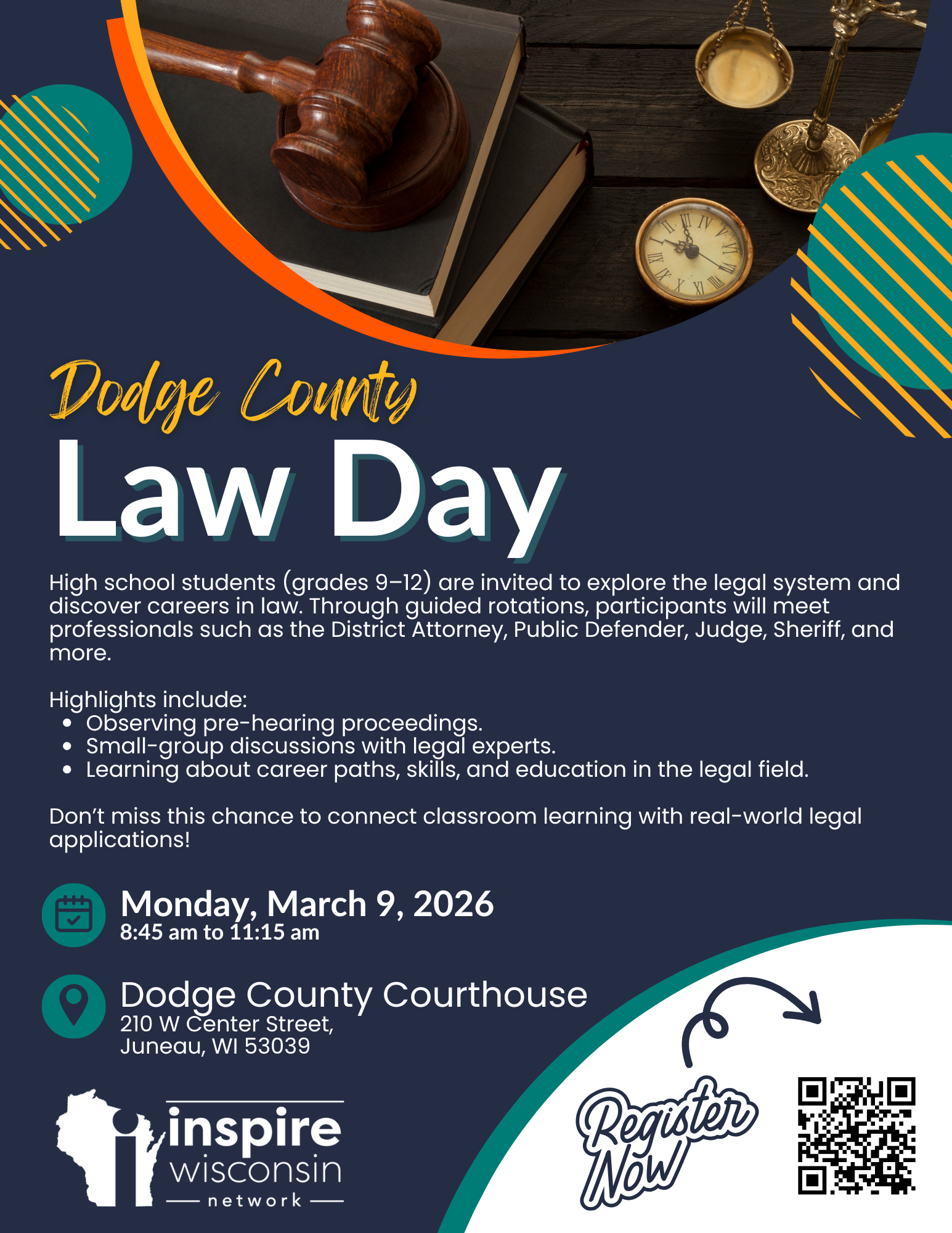 High school students (grades 9–12) are invited to explore the legal system and discover careers in law. Through guided rotations, participants will meet professionals such as the District Attorney, Public Defender, Judge, Sheriff, and more.