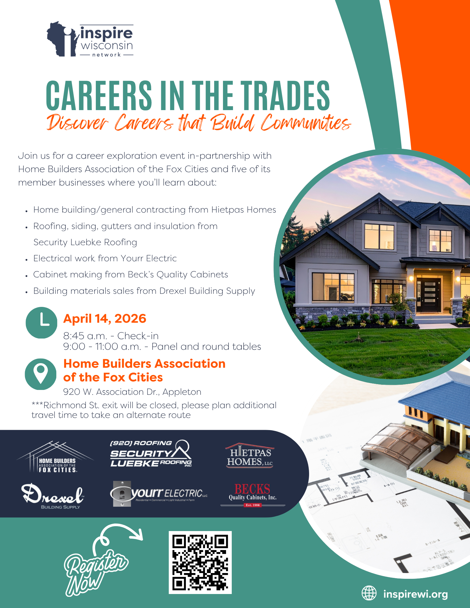 Join us for a career exploration event in-partnership with Home Builders Association of the Fox Cities and five of its member businesses: where you’ll learn about: Home building/general contracting from Hietpas Homes, Roofing, siding, gutters and insulation from Security Luebke Roofing,